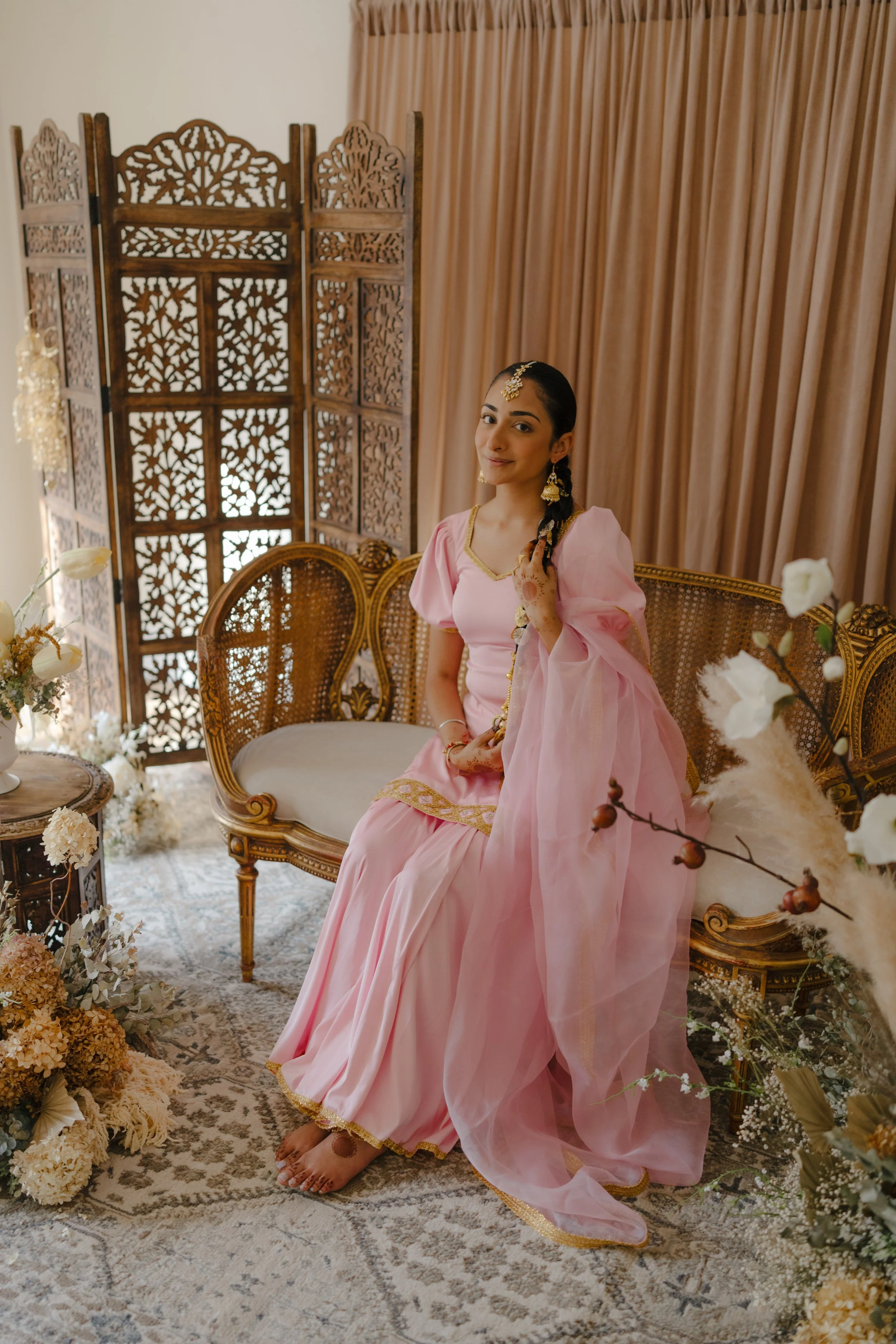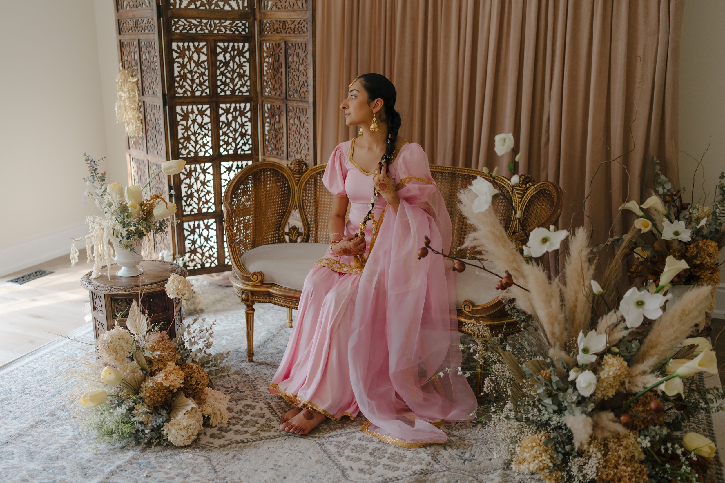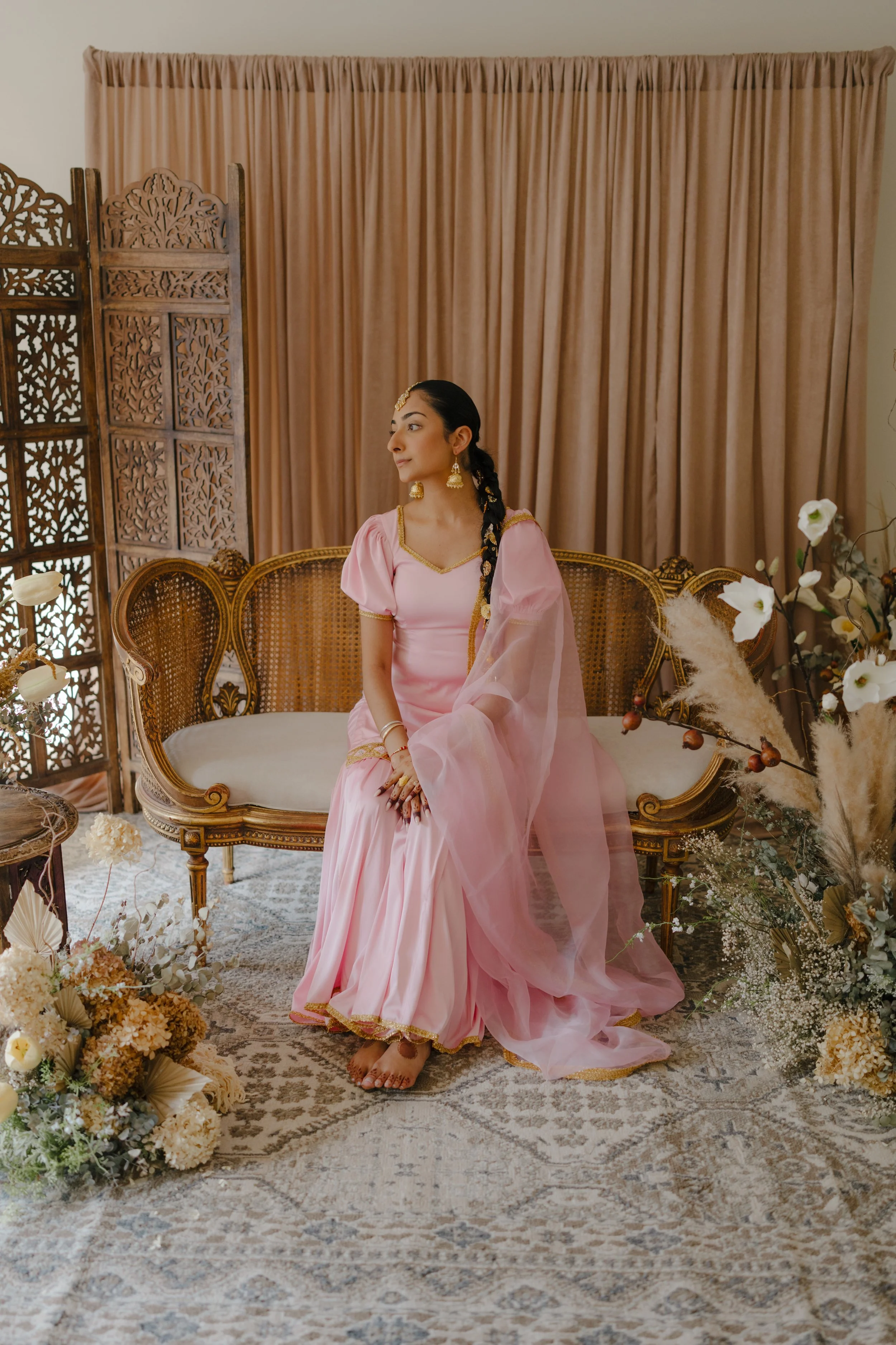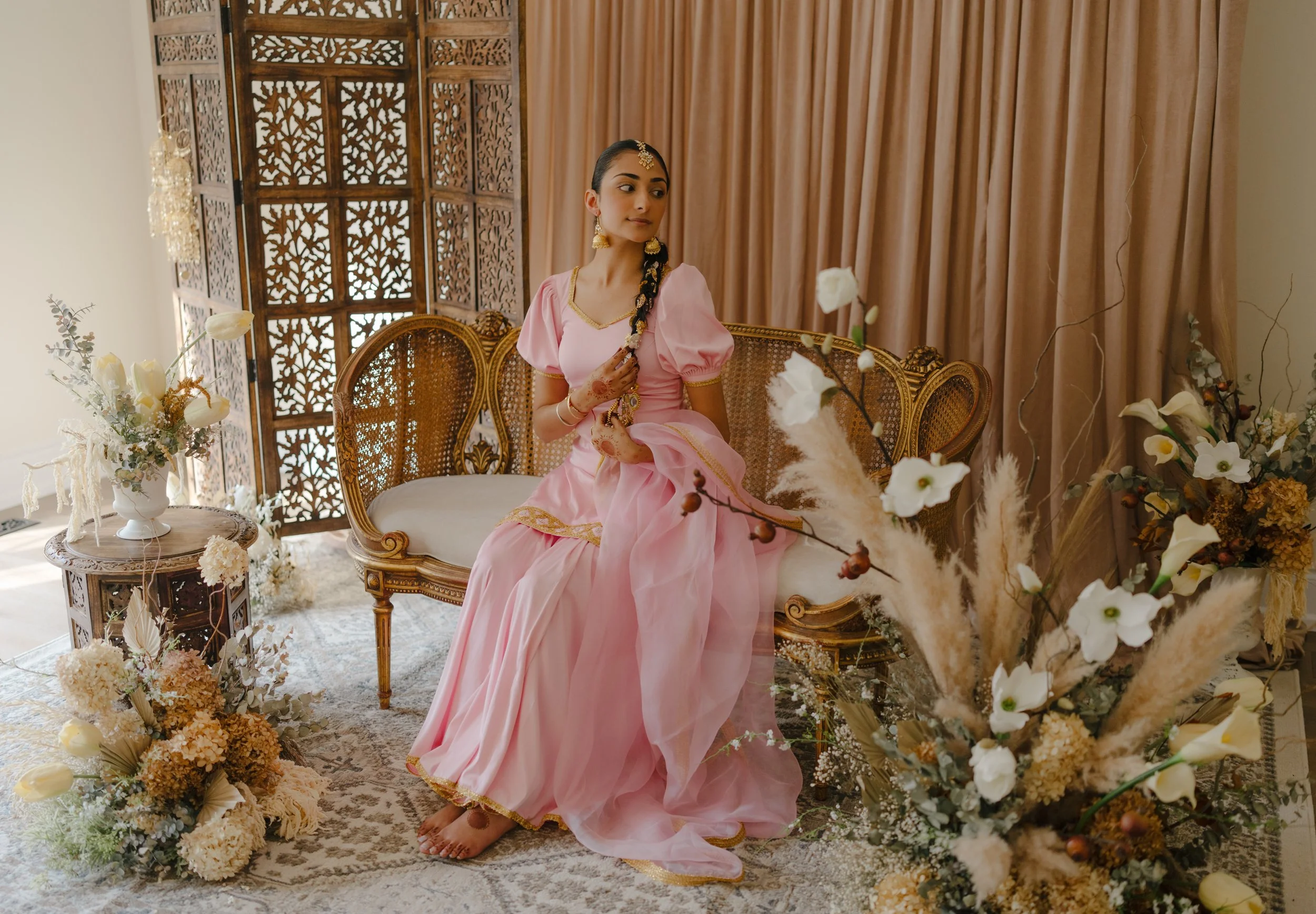 Combining French cane furniture with traditional Indian elements alongside timeless neutral florals creates the ideal ambiance for a beautiful bride to be.