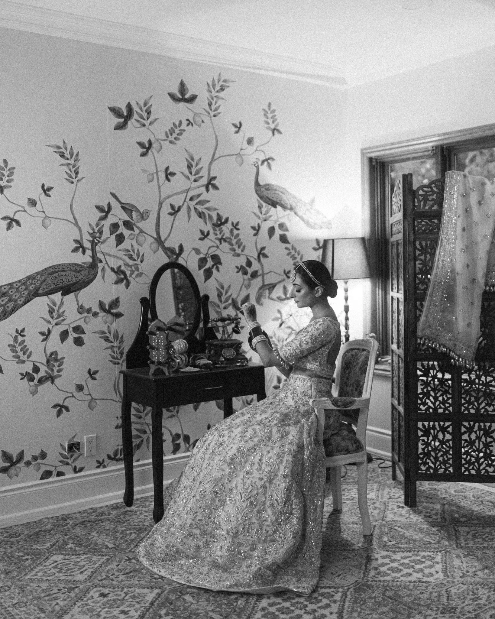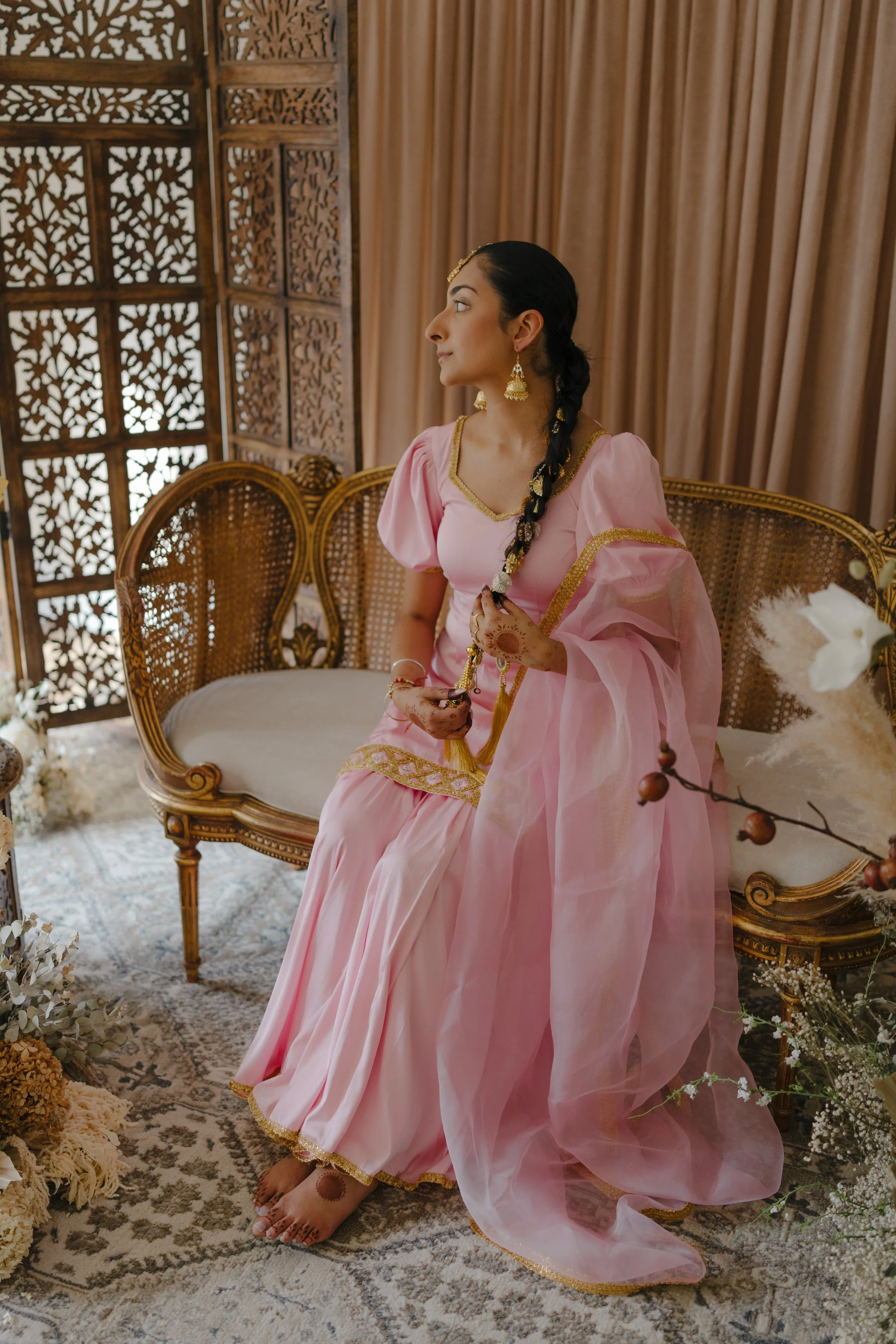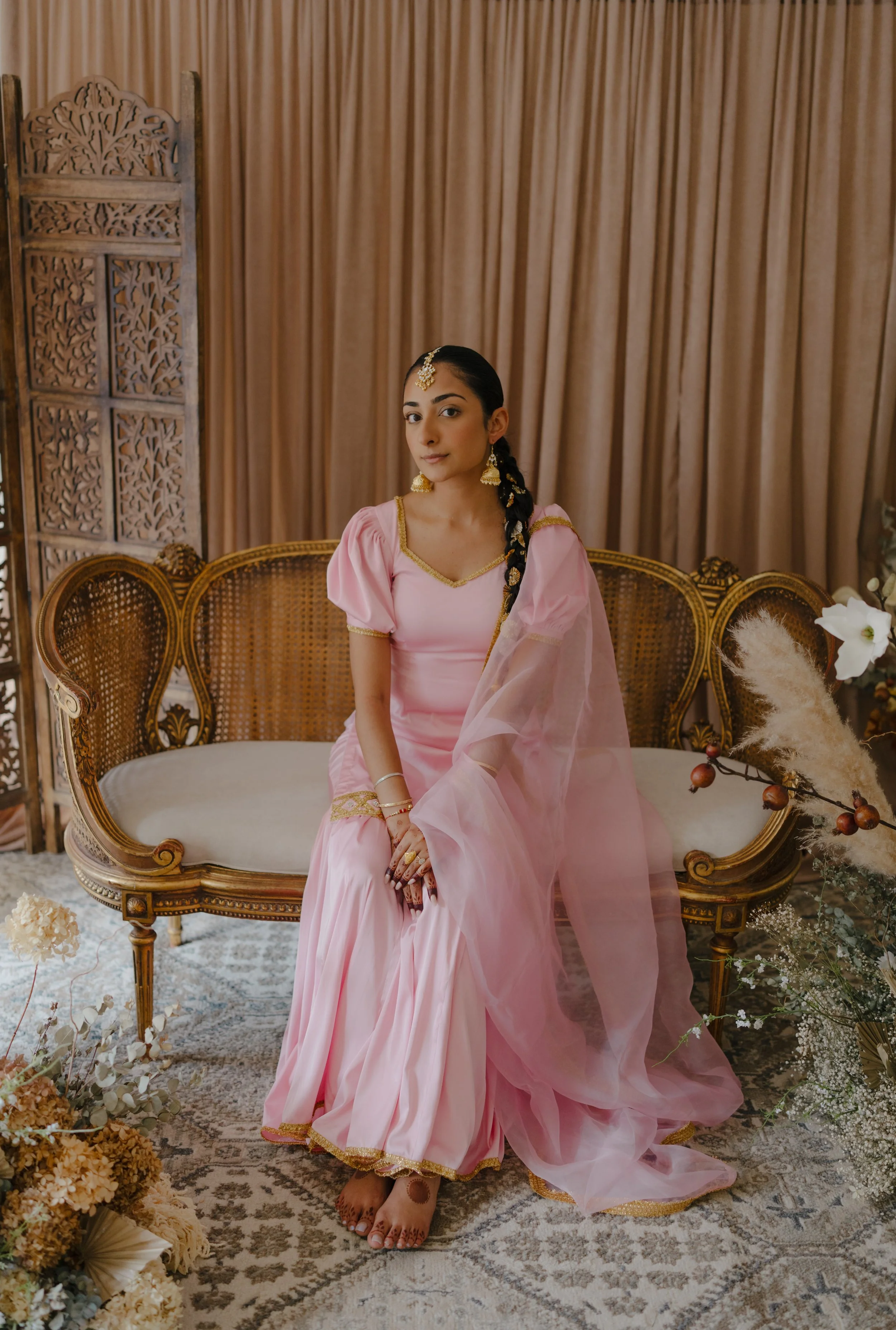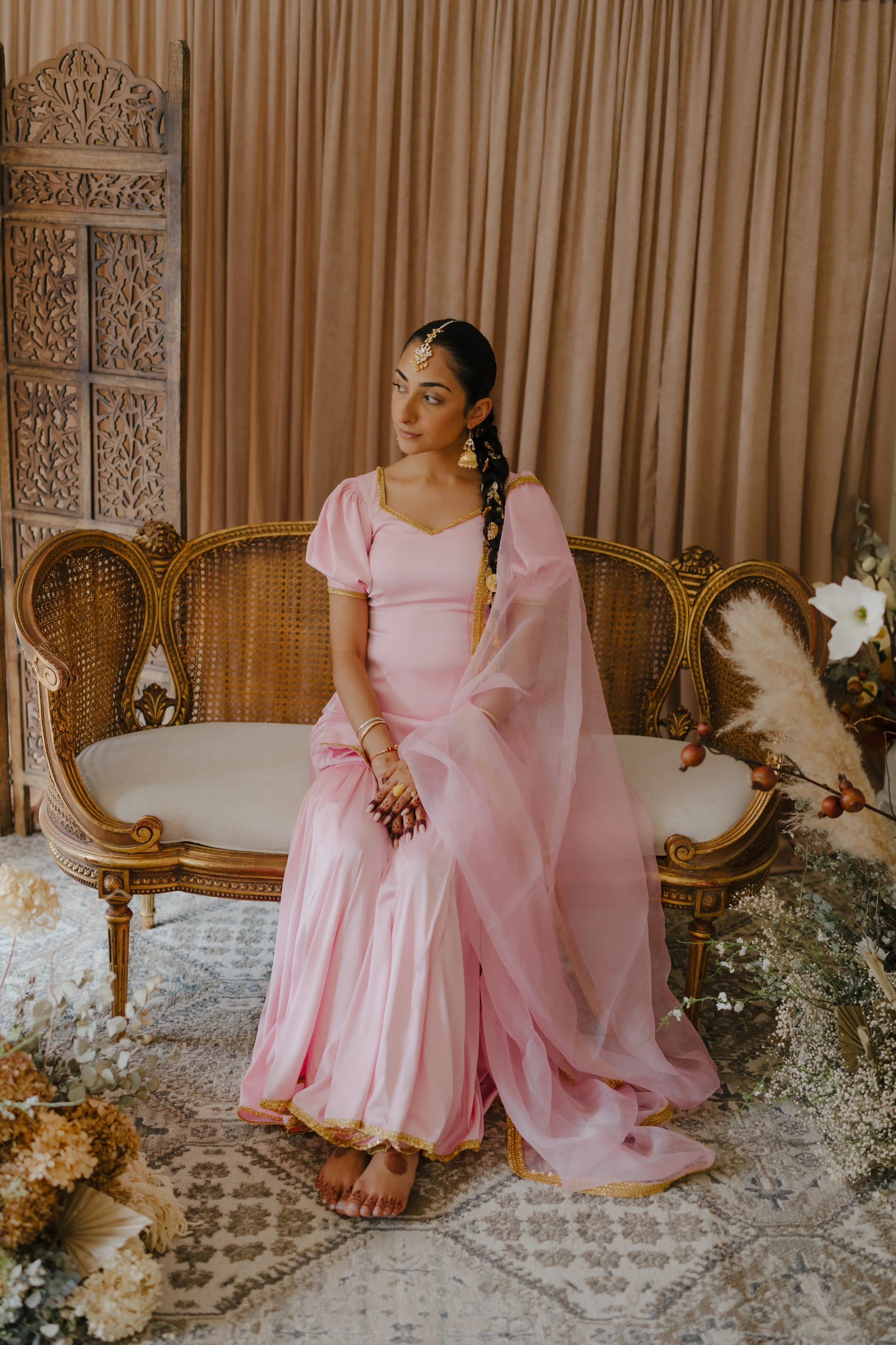 Combining French cane furniture with traditional Indian elements alongside timeless neutral florals creates the ideal ambiance for a beautiful bride to be.