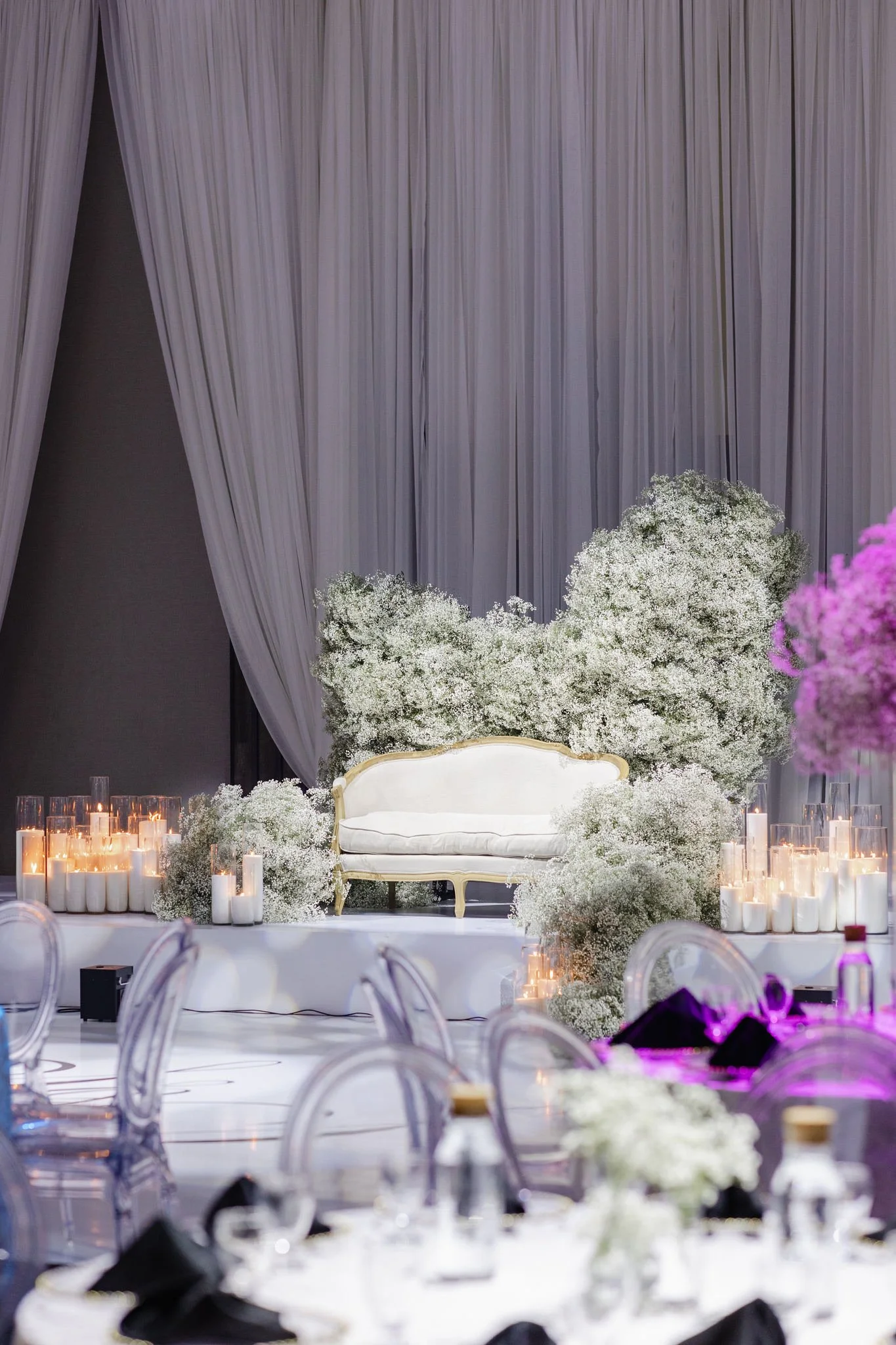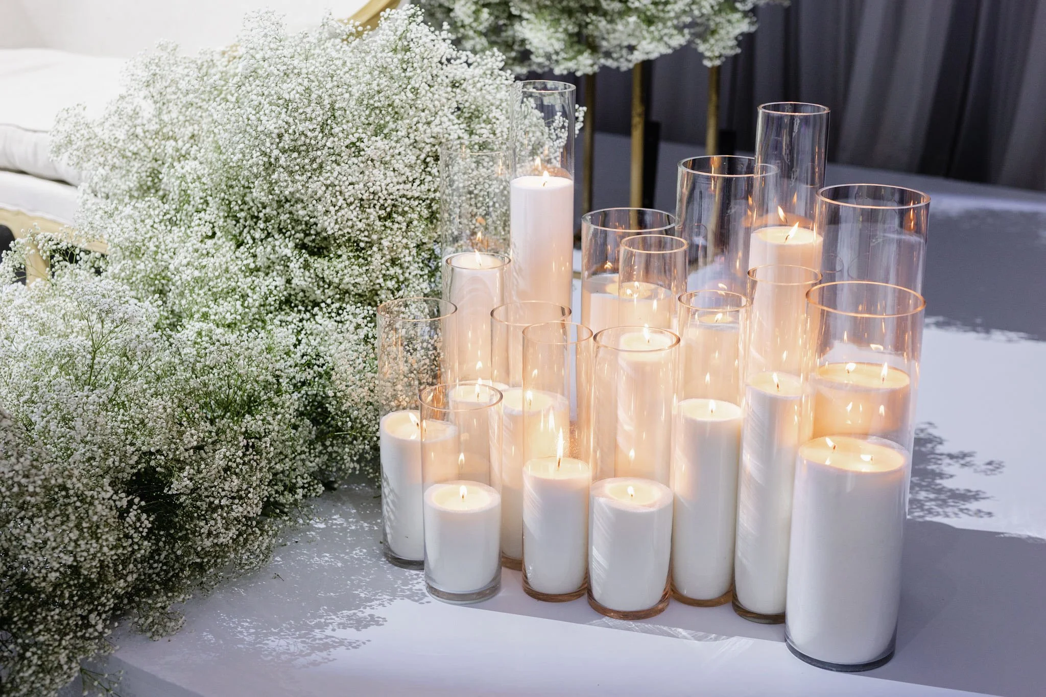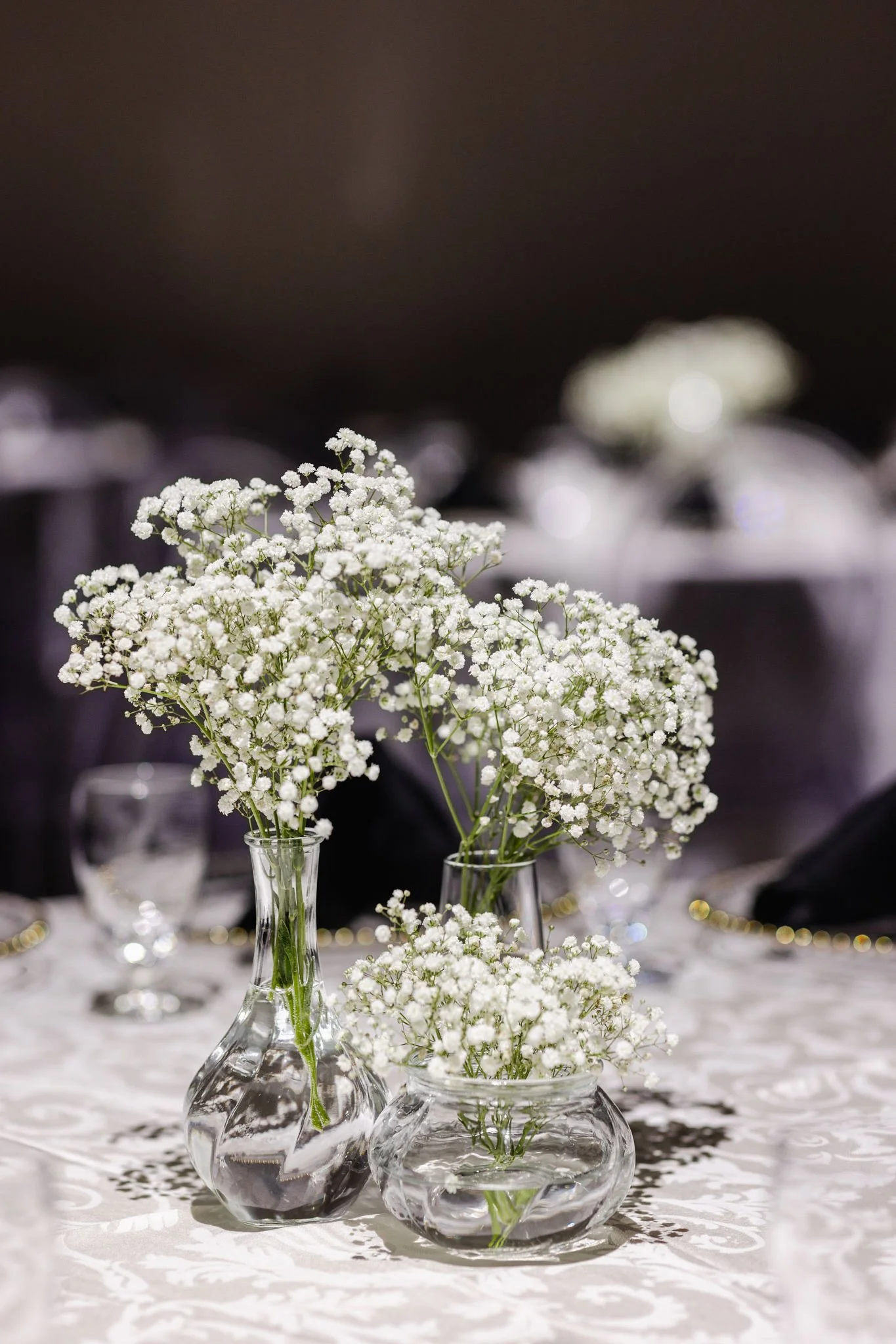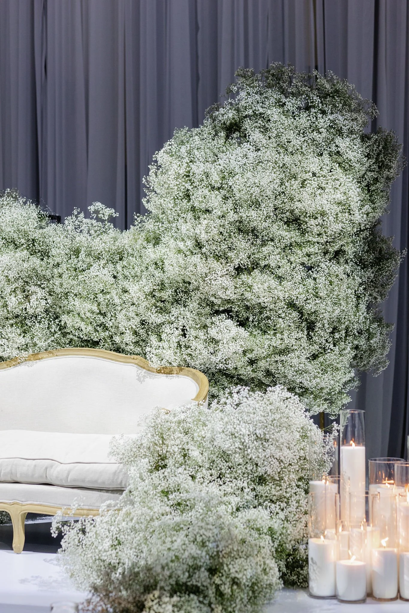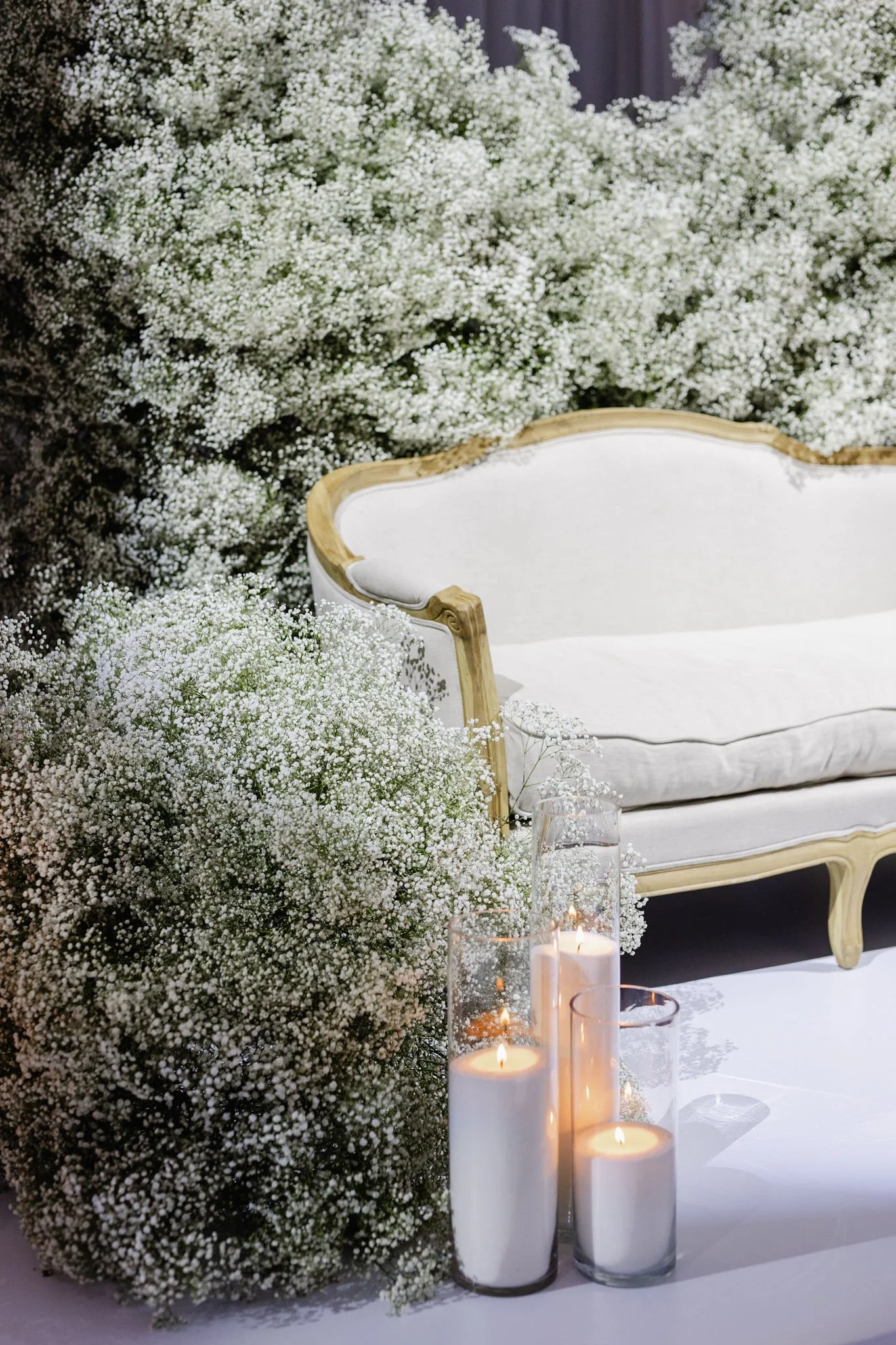 Overflowing with delicate baby's breath, the centerpiece is a soft cloud of white, accented by flickering candles - an enchanting atmosphere filled with love and beauty.